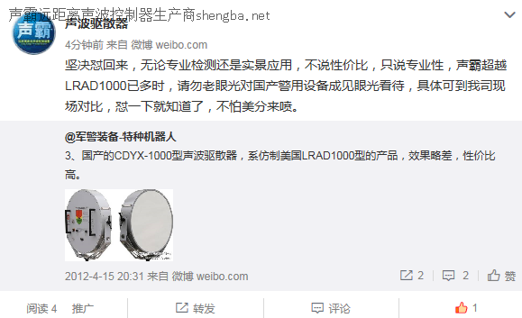 声波驱散器国产与进口之争,声霸微博怒怼美分 赢点赞喝彩